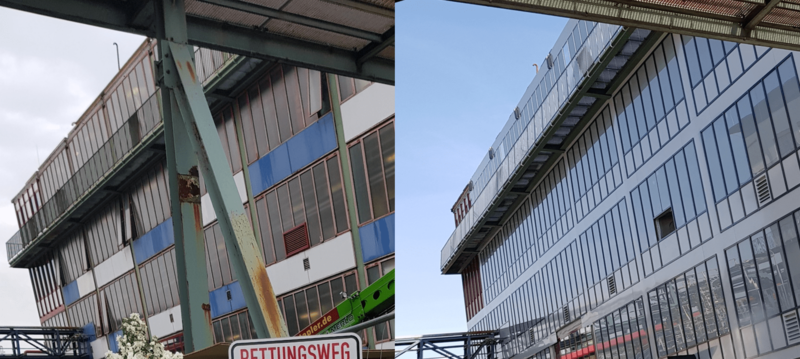 Ein komplexes Projekt durften wir in Halle/ Westfalen abwickeln. Ein älteres Gebäude im Chemiepark benötigte eine neue Fassade. Über 60 Einzelelemente aus Aluminiumfenstern haben wir in die um 7° nach außen geneigte Konstruktion neu eingebaut. Nicht nur die Gebäudehöhe von 15 Metern, auch die Sanierung im laufenden Betrieb waren zusätzliche Herausforderungen. Außerdem musste, besonders bei der Demontage und Trennung der Bestandsfassade, der Ex-Schutz des Nutzers beachtet werden.